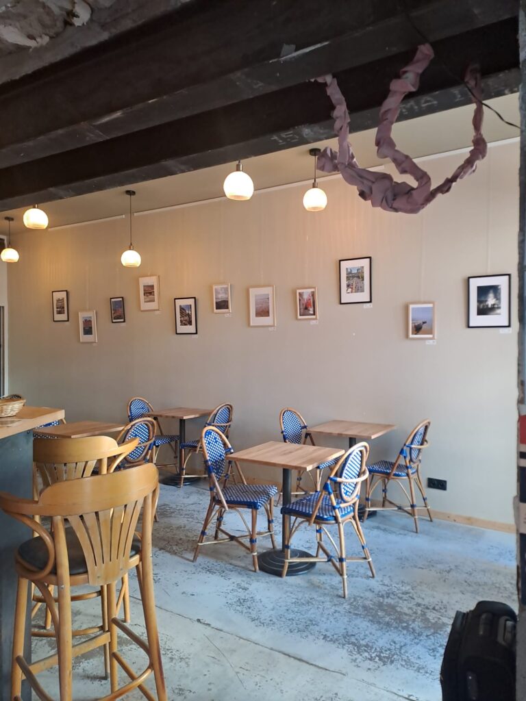 Le restaurant Maison Bagarre, en plein centre de Nantes, a accueilli une sélection de mes photos choisies par l’équipe du lieu. L’exposition s’est construite autour d’images en harmonie avec l’ambiance douce et lumineuse de l’espace : des tons sable, beiges et bleus, ponctués de couleurs plus vives.